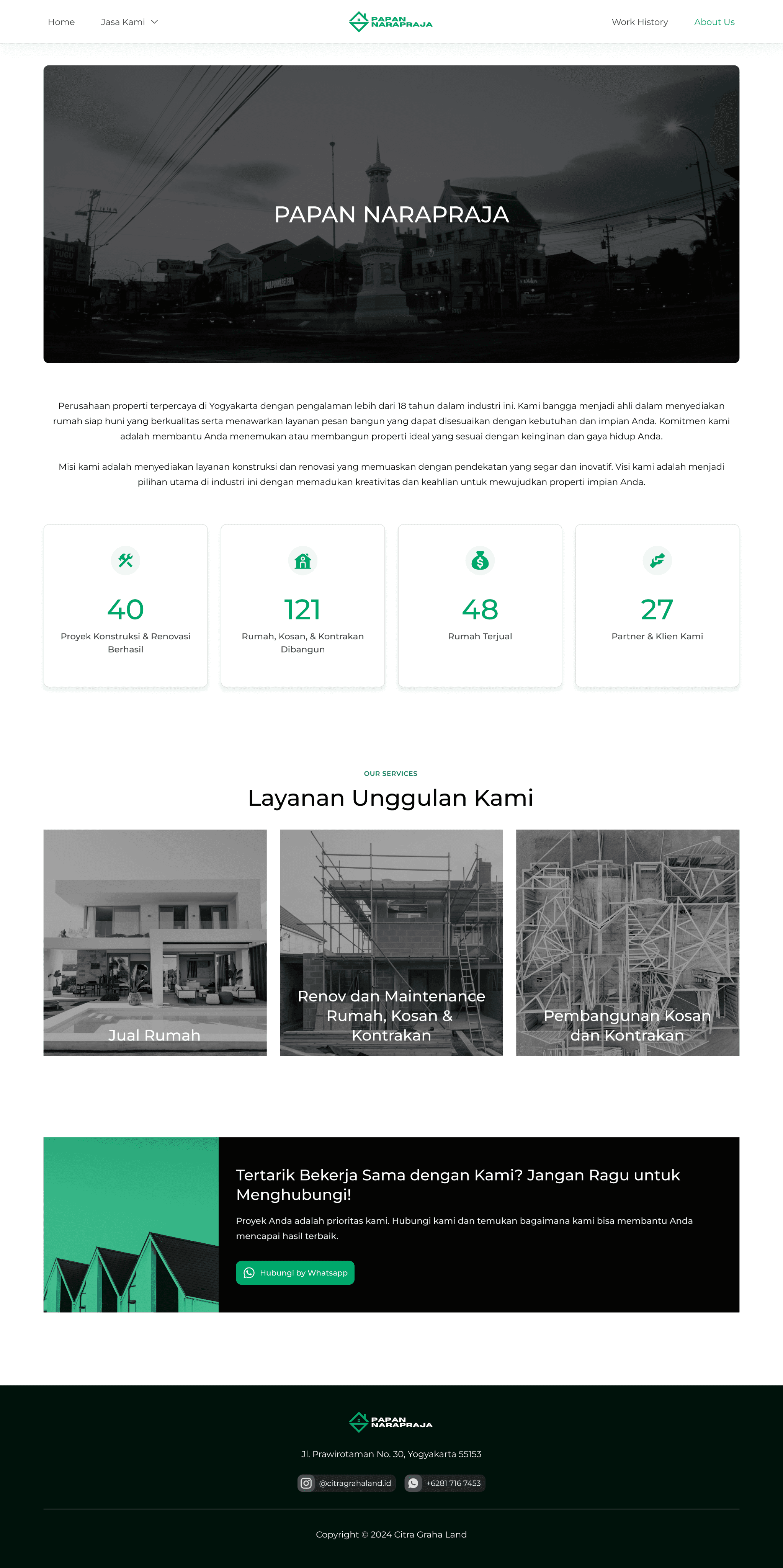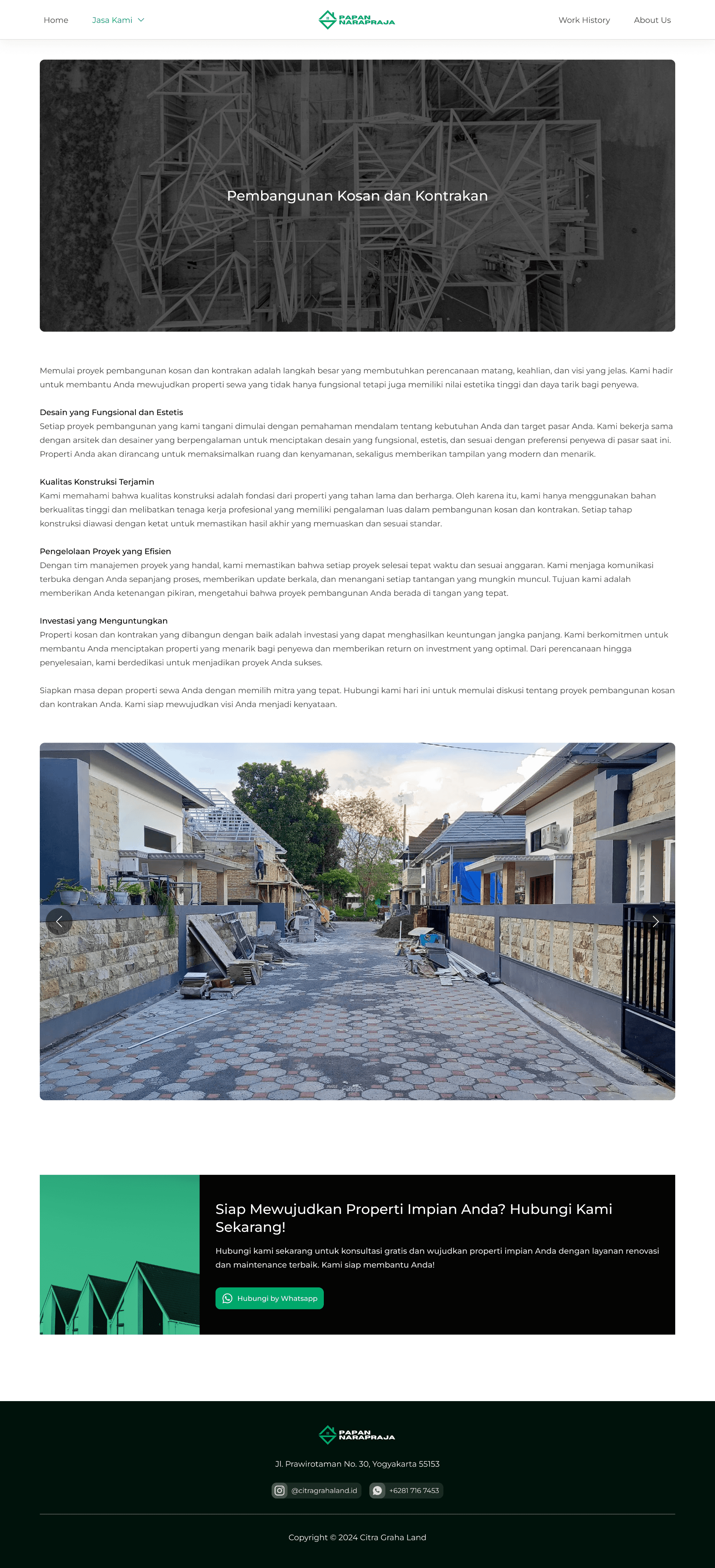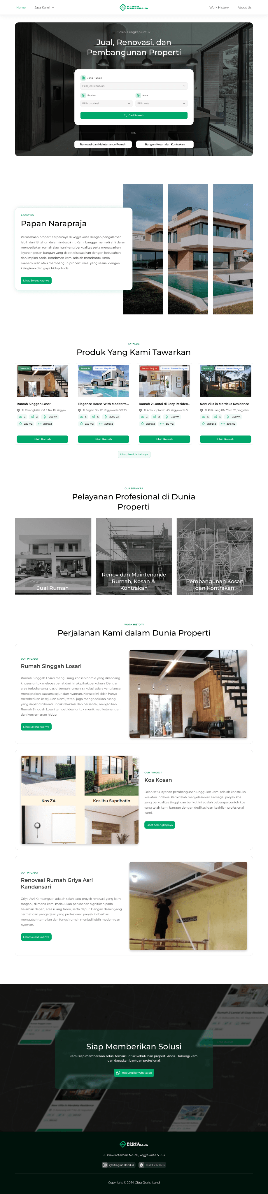 Papan Narapraja is a property company based in Yogyakarta, Indonesia, with over 18 years of experience in the industry. Specializing in property sales, Papan Narapraja offers a wide range of services, including the sale of ready-to-occupy homes and custom-built houses. In addition to property sales, the company also provides comprehensive construction and renovation services for residential properties, boarding houses, and rental units.